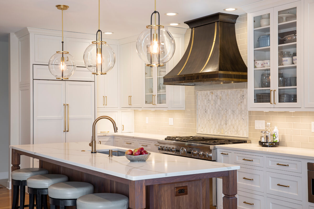 Over-island lights bathes the island in warm light, assisting both culinary tasks and aesthetic allure.