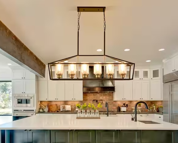 Chandeliers come in tons of different sytles from elegant gold, modern silver, farm house black, rustic antler, but no matter what style, they are a focal point in any kitchen. Chandelier glow perfectly highlights dining spaces or central counters.
